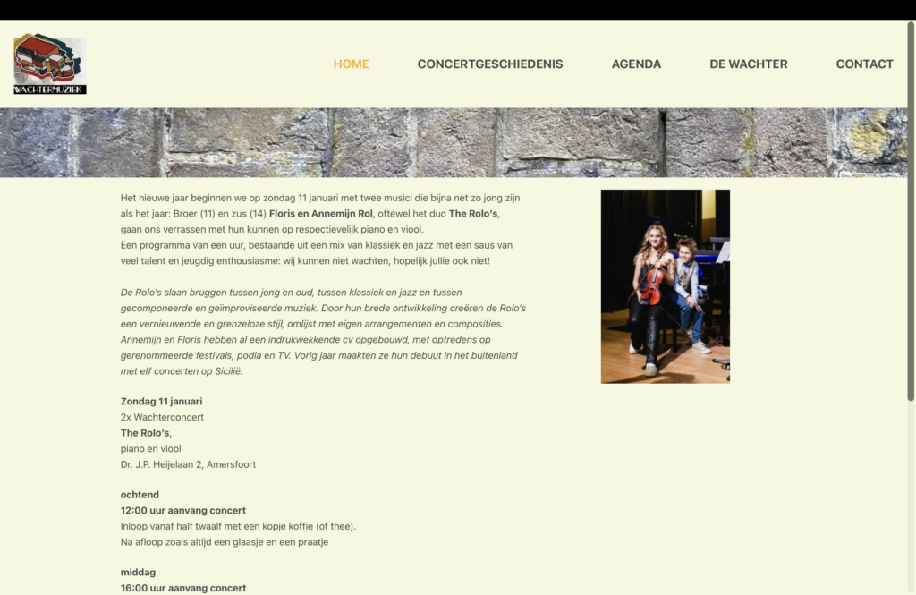 Neem een kijkje op de website en ontdek op welke bijzondere locatie The Rolo’s twee concerten gaan geven. Op de website van Wachtermuziek kunt u tickets reserveren. Klik op de link www.wachtermuziek.nl
